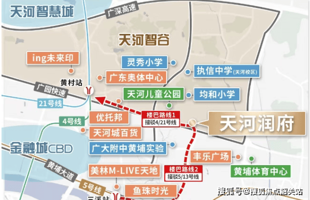 天河润府位于天河智谷板块,紧邻广园快速路,交通网络四通八达,可便捷到达珠江新城、金融城、琶洲等重要商务区。周边轨道交通发达,地铁4号线、21号线黄村站近在咫尺,并且规划有公交首末站,进一步提升了出行便利性。