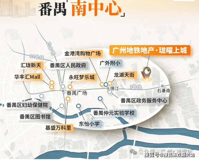 距项目2站的番禺广场,番禺区府所在地,集合番禺的行政、交通、教育、医疗、文化中心,是与北万博平齐的番禺南中心。