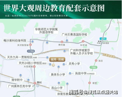 项目自配 15 班幼儿园和 24 班小学,小学引进广州天河外国语教育集团合作办学。天河外国语学校自 2012 年创办以来,迅速成为广州优质教育品牌,拥有多项荣誉称号。学校毗邻月亮湖,打造现代山水书院,还原 “自然教育” 真意。隔壁缦云确认配建天河外国语教育集团办学的九年一贯制学校,对口中学为越秀观樾小学,优质的教育资源与纯粹的高端改善人群,让业主对子女教育无需担忧。