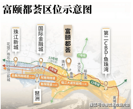 富力南驰・富颐都荟地处 “珠 - 金 - 琶 - 鱼” 珠江黄金 8 公里范围内,位于广州第二 CBD 核心地段,周边由国际金融城、临港经济区、琶洲形成黄金三角区,发展前景广阔。第二 CBD 占地面积达 59 平方公里,相当于 10 个珠江新城,未来将成为广州新的经济增长极,项目作为区域内少有的全配套大盘,将优先享受板块发展红利。