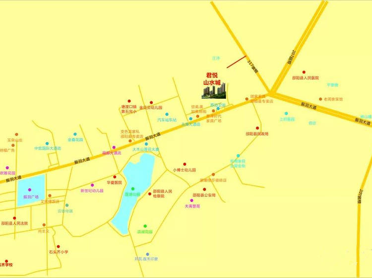 区位便利——君悦山水城位于邵阳县新城脉轴中心,毗邻振羽大道,邵阳大道,环城路,小区门口有1路、3路公交车,距邵阳县汽车总站200米,振羽广场1000米,二广高速路口3000米。