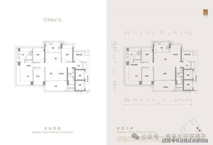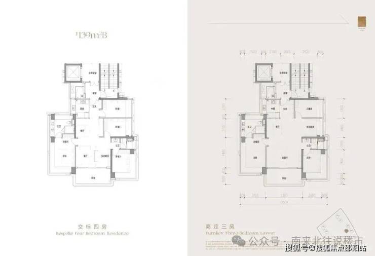 139㎡四房两厅两卫:位于3栋,提供A(竖厅南北通透)、B(双龙抱珠)两种格局。四开间朝南设计,主卧配备270°无柱转角飘窗。由SCD团队打造,提供“风尚米”和“经典灰”两种装修风格,可定制为高配版三房。