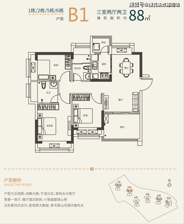 88㎡的3房2厅2卫,设计的竖厅南北通透格局,客餐厅一体化,动静分离,超大阳台灵动设计,L型厨房,也有带1个小生活阳台。
