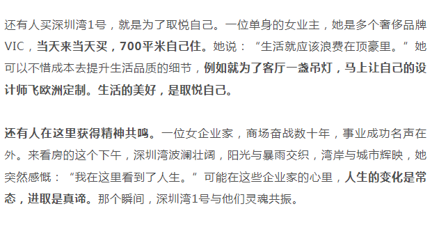 深圳湾1号让精英们趋之若鹜的原因,是“懂得赚有钱人的钱”。就像上面那位“中国巴菲特”形容的,财务自由了,遇到触动灵魂的东西,绝不能错过,绝不能留遗憾。