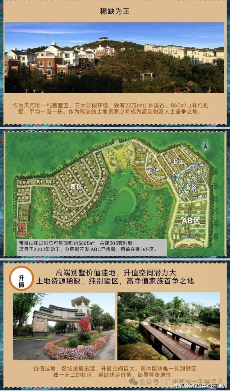 帝景山庄是由合生创展在天河奥体板块开发的低密纯别墅区,小区分为A、B、C、D区以及E区等五个别墅组团,开发周期由2006年至2015年。小区北部靠近科学城,南边邻近金融城,25分钟车程可以到达珠江新城、琶洲,是可以作为第一居所的城市半山别墅。