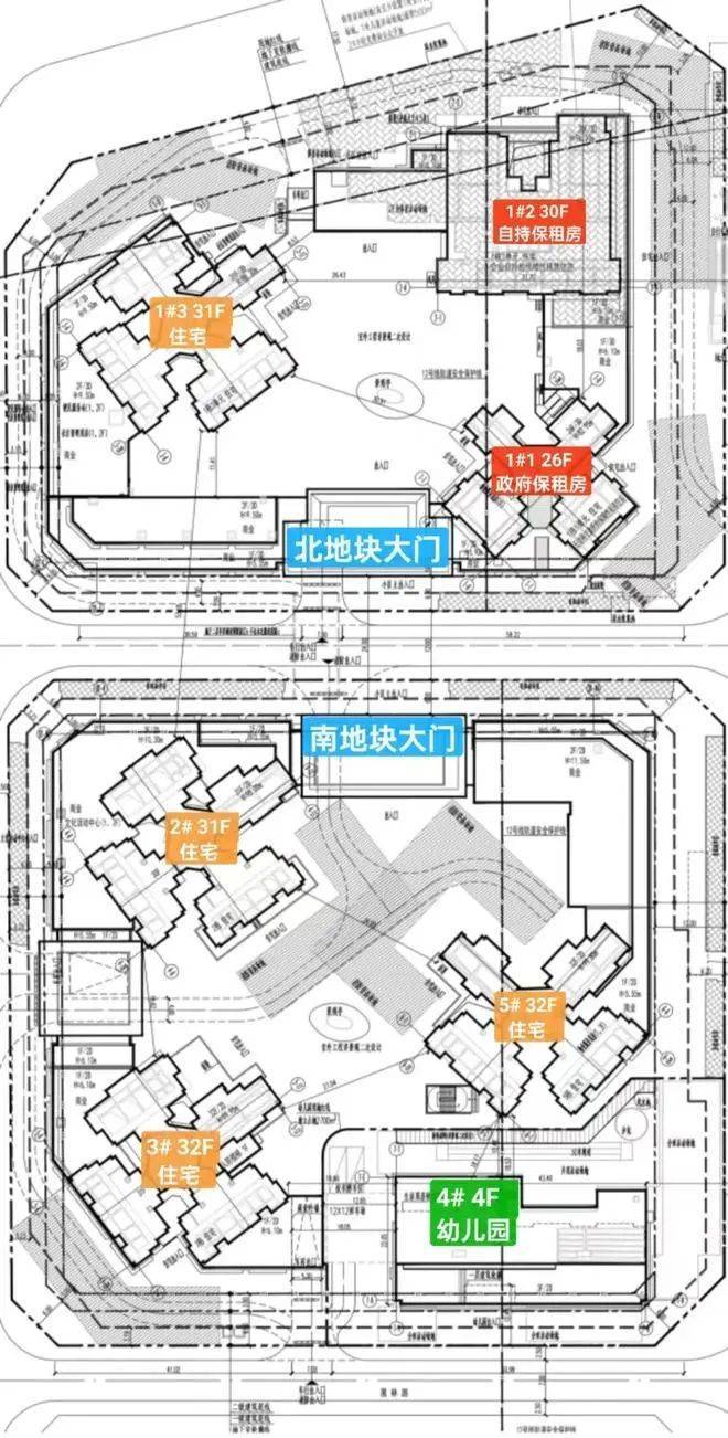 2、3、5栋为纯住宅,总高31-32层,4栋为1所4层2970㎡幼儿园,容积率4.3。