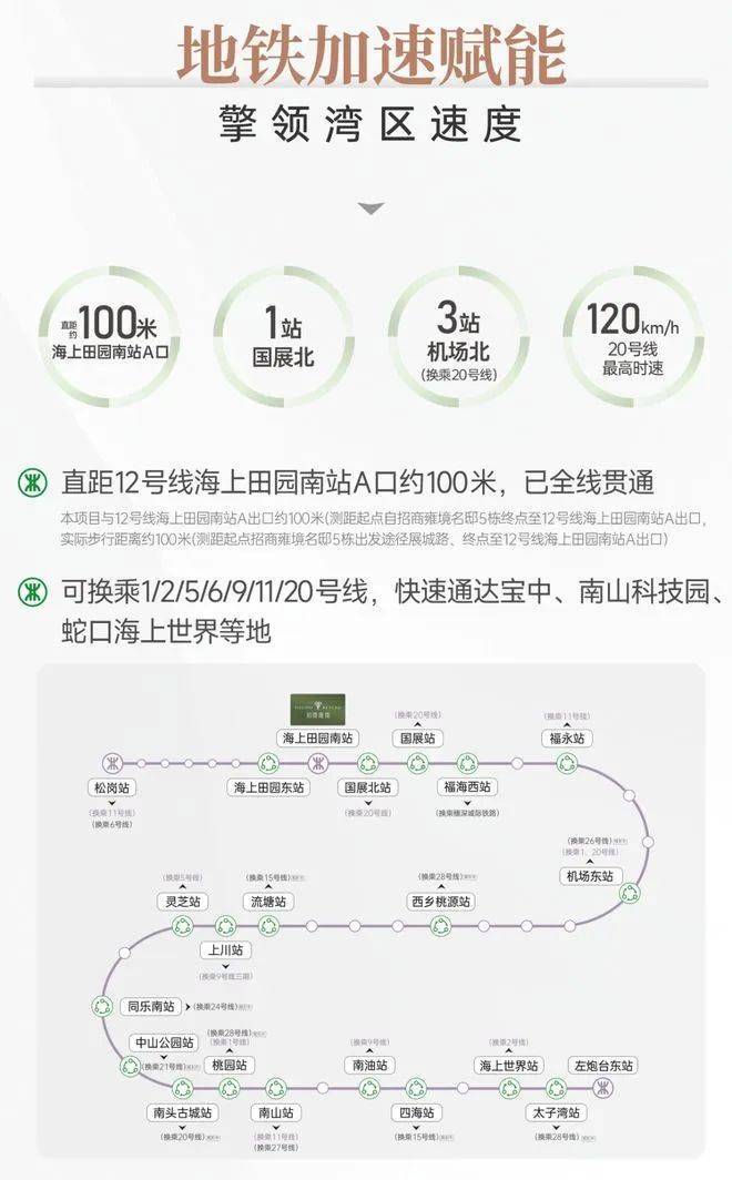 项目出门就是12号地铁线“海上田园南站”,步行约500米国展北站(12/20号线),5站到福永可换乘11号地铁线。可换乘1/2/5/9/11/20号线等多条线路,