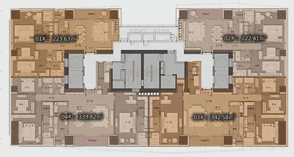D1户型:约343㎡4房2厅4卫:B栋28-52F(高区),东朝向