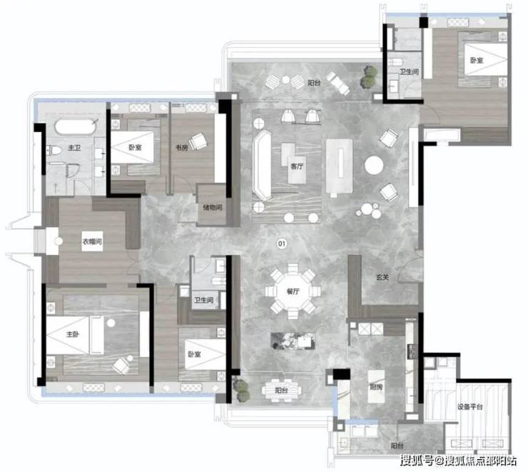南北打造了11个采光面,户型延续了LDKG大方厅设计,客厅超大面宽,中西厨随意切换,且配置了3个阳台,大空间、观景面和通风采光通通到位。