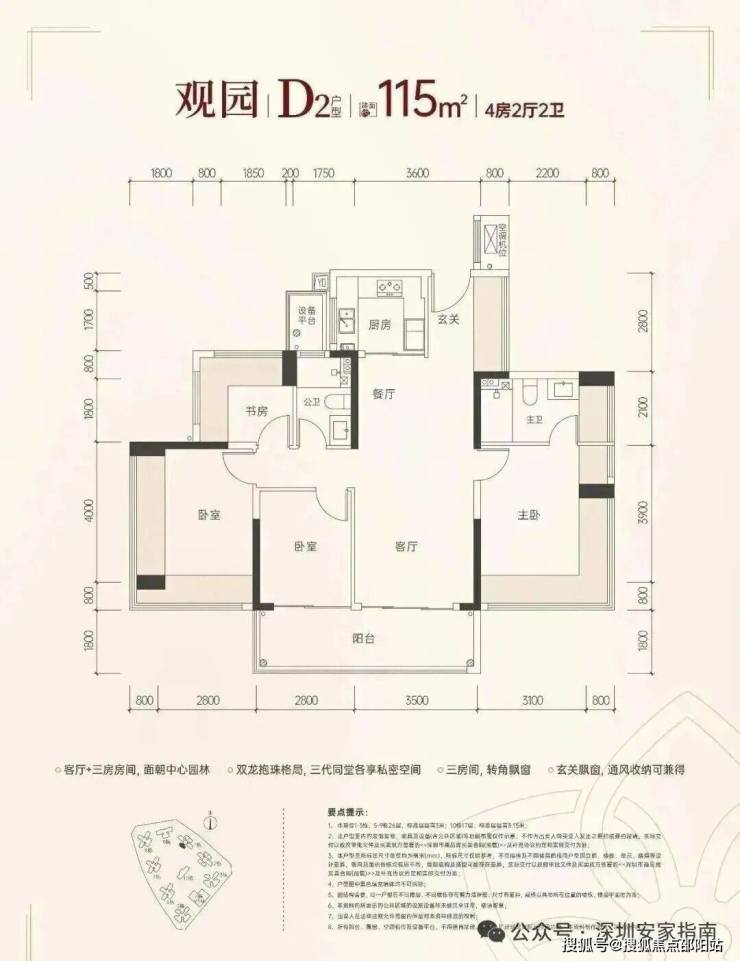 115㎡的4房2厅2卫,设计的是竖厅双龙抱珠格局,客厅3.5米开间,四开间朝南,分别做到了主卧18.33㎡/次卧17.28㎡/次卧10.36㎡/次卧7.41㎡(包含墙体飘窗),U型厨房,卫生间干湿分离,还带1个设备平台,得房率约100%(包含赠送),客厅连接次卧出11.34㎡的大阳台,西南朝向。赠送面积约27.59㎡。