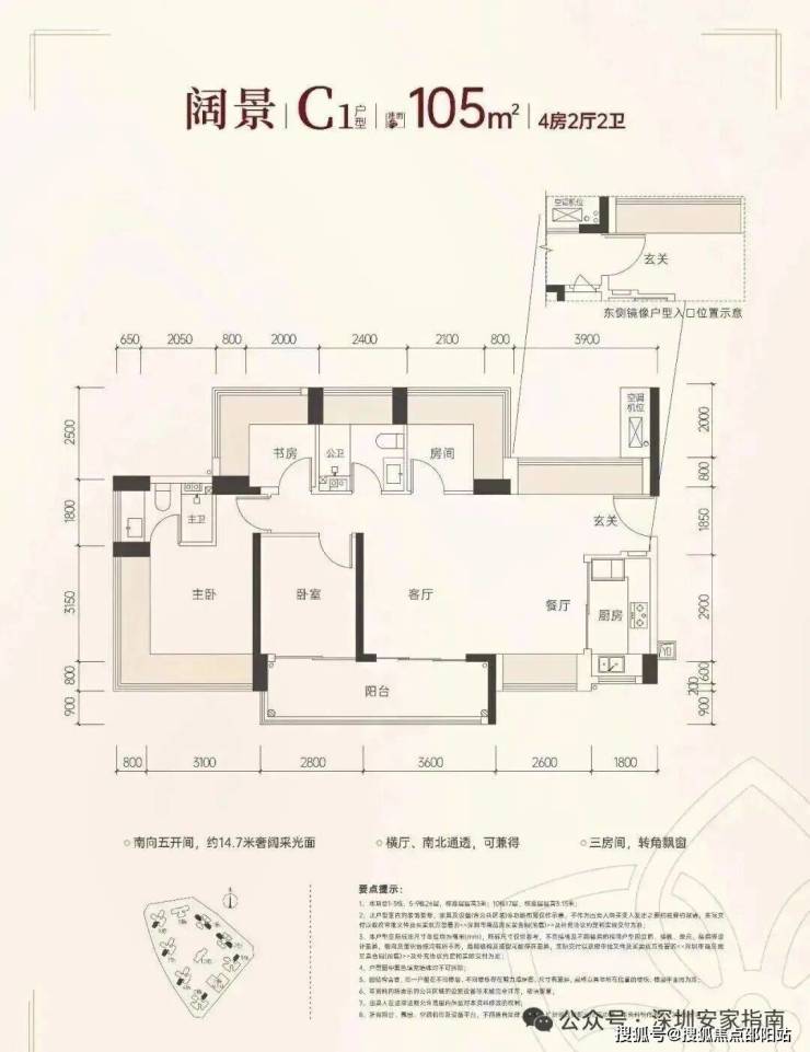 105㎡的4房2厅2卫,设计的是横厅南北通透格局,客餐厅6.2米开间,五开间朝南,约14.7米奢阔采光面,分别做到了主卧16.9㎡/次卧8.96㎡/次卧8.12㎡/次卧7㎡(包含墙体飘窗),U型厨房,卫生间干湿分离,得房率约100%(包含赠送),客厅连接次卧出10.88㎡的大阳台,首推的1/2栋主朝西南向。赠送面积约25.72㎡。