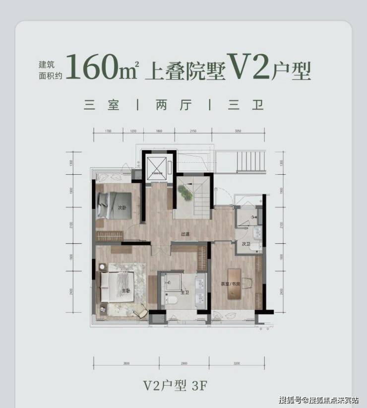 上叠院墅 V2 户型,约 160㎡(或 158.1㎡ ),三室两厅三卫。有私人电梯、双重玄关,约 6.1 米度假观景横厅,270° 三面采光 。约 30㎡L 型花园露台,能欣赏 270° 环幕景观。主卧奢阔,配备步入式衣帽间与独立卫浴,还有可拓展空间随心改造。