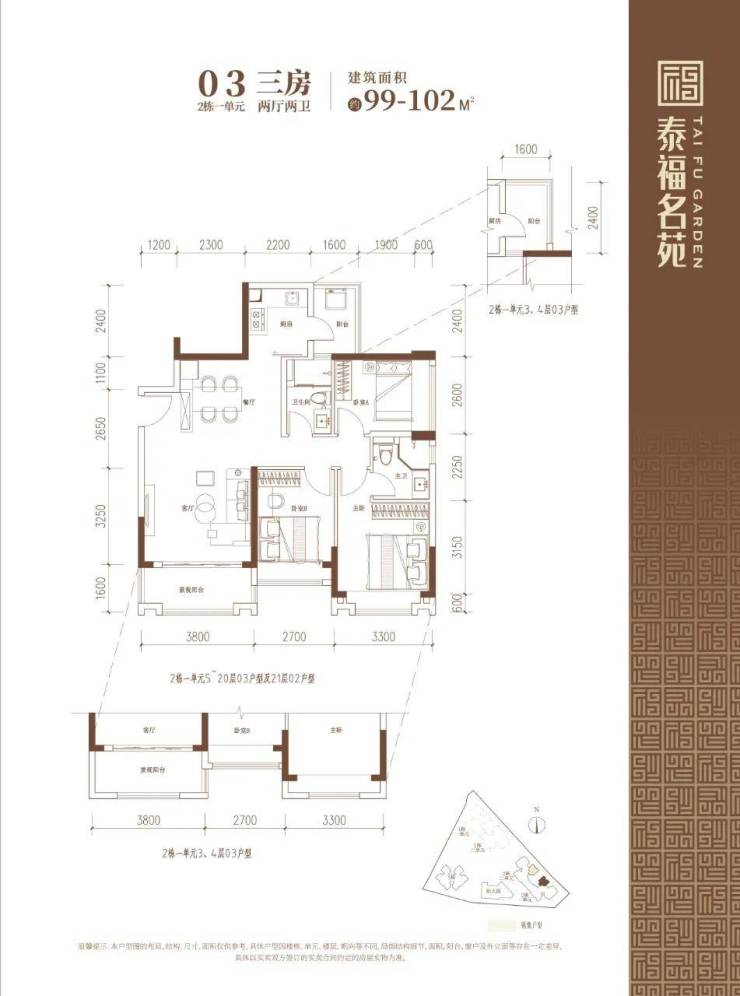 90-102㎡的3房2厅2卫户型。这几个户型都是在主人房多设计一个卫生间,私密性更强,也让家人间的生活更加方便。