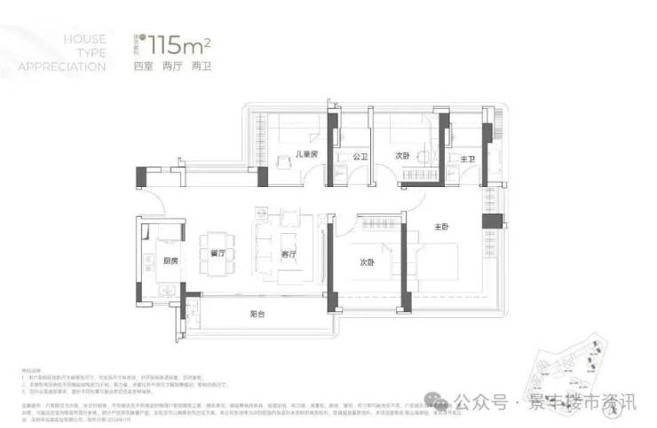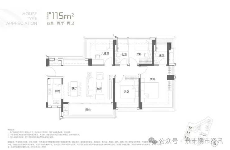 115㎡的4房2厅2卫:横厅南北通透格局,客餐厅6米开间,LDKB一体化,全屋飘窗,4个卧室分别做到了3.9米/3米/2.8米/2.6米的宽度,主卧加1个次卧270°全景飘窗,客厅出6米长的大阳台,L型厨房,得房率约95-97%(包含赠送),西南或东南朝向。115平米户型分布在1栋1单元、1栋2单元、1栋3单元01/02户型,01户型西南朝向都是看小区外围,02户型看向小区;