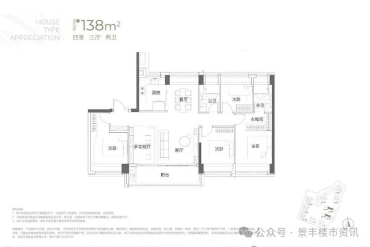 138㎡的4房2厅2卫:竖厅南北通透格局,专梯入户,客厅6.1米开间,LDKB一体化,全屋飘窗,4个卧室分别做到了3.9米/3.25米/2.9米/2.8米的宽度,主卧加1个次卧270°全景飘窗,客厅出6.1米长的大阳台,U型厨房,得房率约95-97%(包含赠送),阳台主朝西南向。138平米户型分布在3栋1单元、3栋2单元、4栋1单元、4栋2单,4个单元纯大户型。