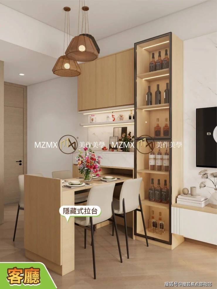 除咗藏餐台,仲有好多收納空間,上層擺餐具、杯碟,中間開放式擺裝飾花瓶、小擺設,下層櫃桶收雜物,連酒櫃都一拼搞掂,擺啲紅酒、威士忌,歎返杯好Chill!