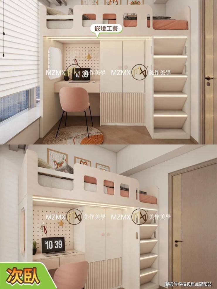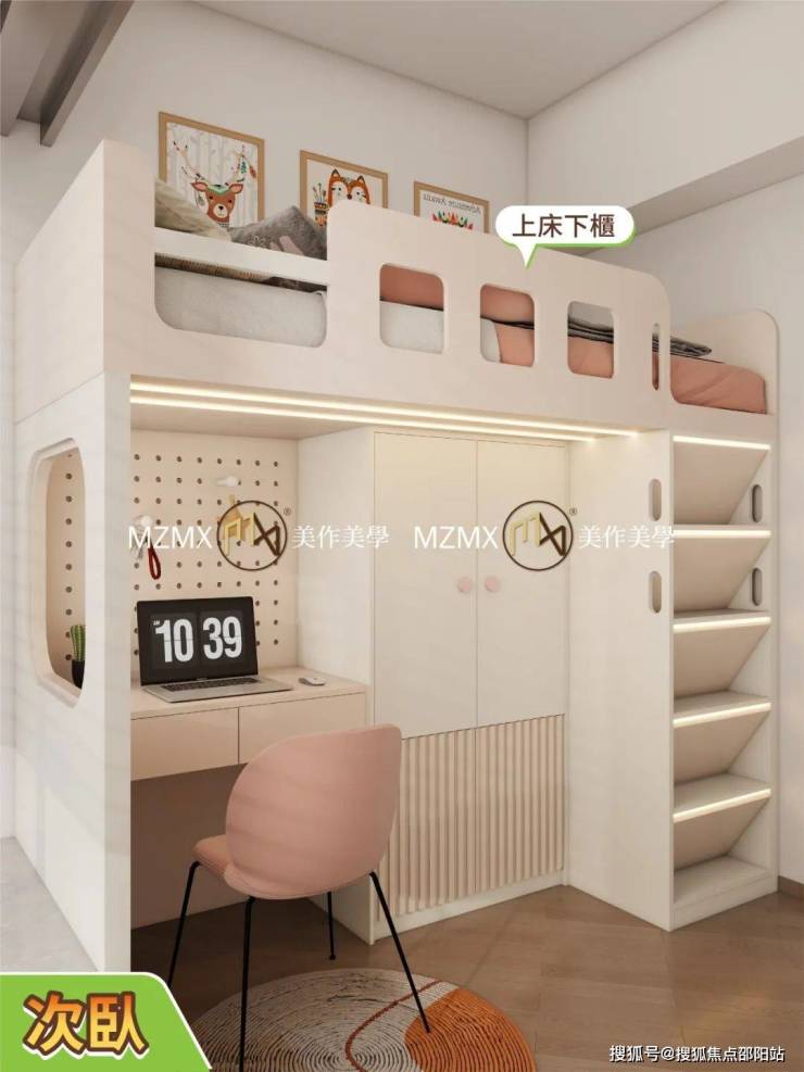 樓梯做咗抽屜收納,一級級上落好安全,書桌旁邊仲有洞洞板,細路仔可以掛啲小飾物、學習用具,增加互動感,變成專屬小天地。
