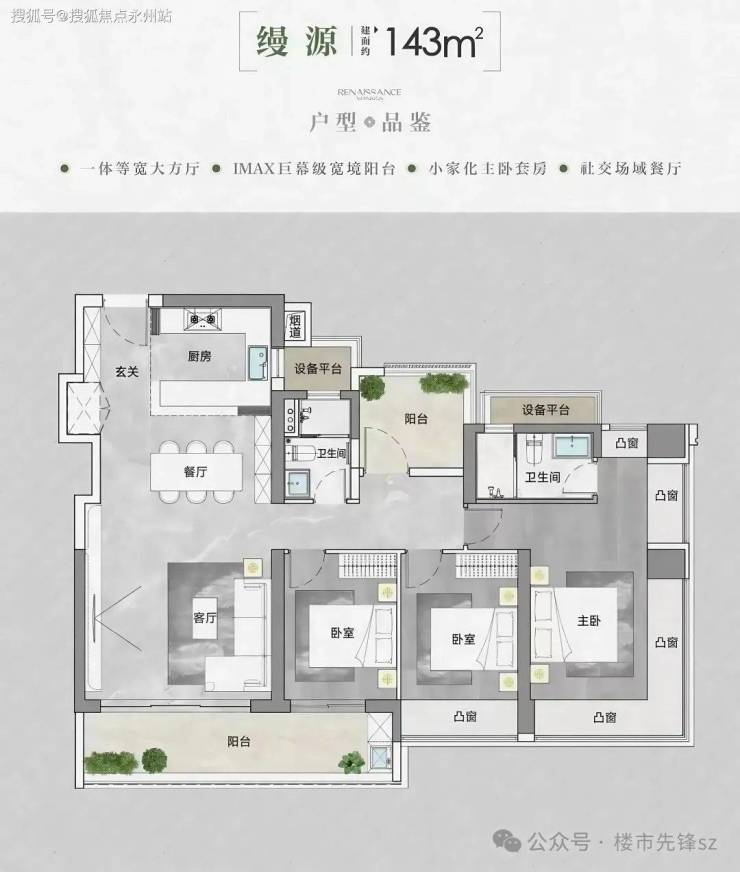 105㎡户型:这个户型的得房率比较高,赠送阳台可以改成房间,主卧飘窗是L型设计,而且中间没有承重墙,很好利用。