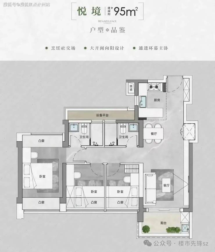 95㎡户型:阳台+3卧室同一个朝向,如果是东南或者西南,这种户型的采光会非常的不错;缺点就是:走道过长,有点浪费空间;主卧的设计很有意思,双飘窗南北通透的格局,而且主卧的卫生间相对而言比较独立。