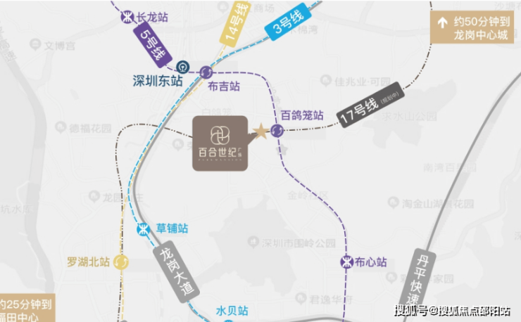 【交通】百合世纪广场紧邻地铁5号线百鸽笼站(步行约100米),且未来规划有17号线罗岗站约450米在此交汇通过地铁5号线,1站可换乘3/14号线,4站直达福田核心区,7站快速通达深圳北站。1 公里接驳龙岗大道,2.5 公里直达丹平快速。