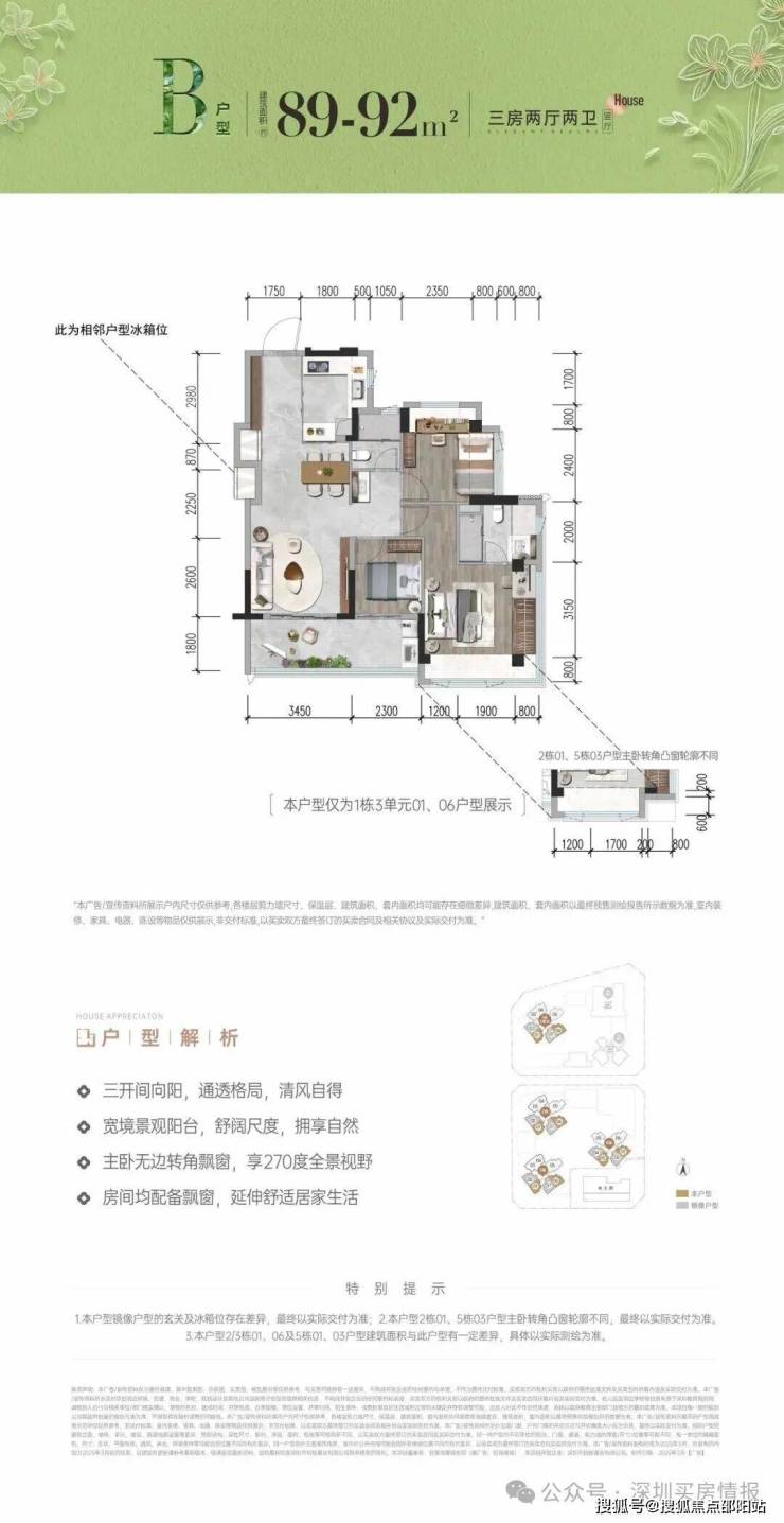 招商会展湾雍境名邸位于宝安沙井大前海会展湾片区的招商会展湾雍境名邸,本次是招商会展湾雍境二期,首推1栋3单元的195套房源,面积段有80㎡3房1卫,91㎡3房2卫,92㎡3房2卫3种户型,是3梯7户的普通高层,预计2027年9月精装交楼。