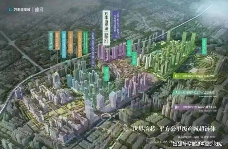 万丰海岸城,宝安沙井新桥板块,占地540万㎡,分A/B/C三区开发,由深圳海岸集团与万丰股份合作。项目涵盖商业、住宅、产业、甲级写字楼和酒店,是超大型综合体。