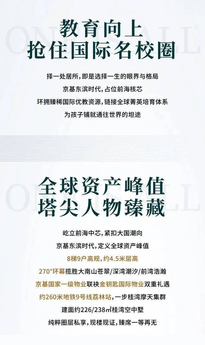 作为京基100缔造者——京基30载钜献前海的壹号作品,京基·东滨时代从规划伊始便收揽了行业内外的目光,匠心品质让每一位到访者由衷赞叹。一步桂湾天赋,将自然与繁华,化为生活的优越。8梯9户,纯粹层峰圈层,235㎡云端公馆,约4.5米层高,户户阔景阳台、通燃气,承袭京基品质创建,准现房,臻席前海争藏。