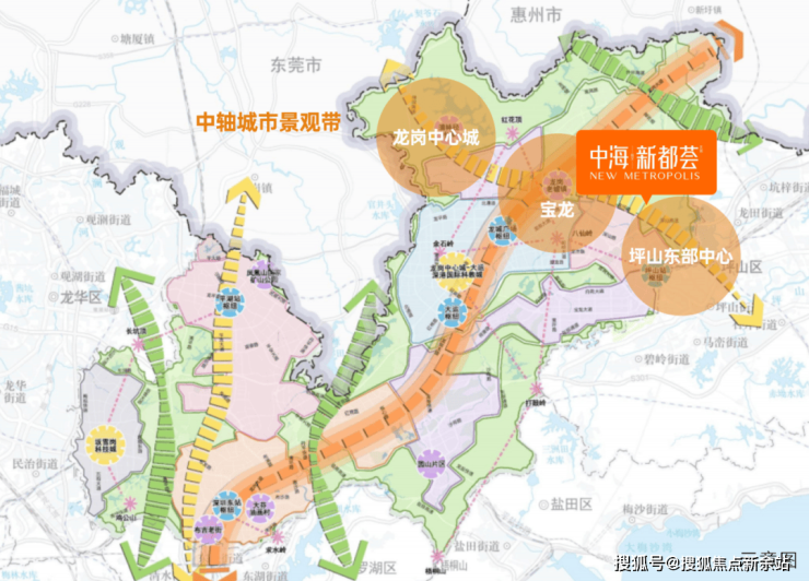 在深圳“十四五”规划中,将龙岗区未来的发展定位为深圳城市东部中心,“一轴两带三通廊”②规划建设,规划龙中核心区由双龙沿16号线横轴发展,开启龙岗新地铁横轴线发展新动力,推动龙中居住核心板块外拓发展。本项目处于“龙岗中心城-宝龙-坪山东部中心中轴城市景观带”,重启龙岗高品质居住时代,即享城市发展利好
