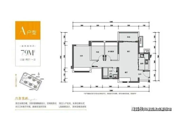 89㎡的3房2厅2卫,设计的是竖厅格局,客厅3.3米开间,S墙体设计预留双开门冰箱位,动静分区,三开间朝南,L型厨房,3个卧室的宽度分别为3.5/2.7/2.5米,得房率87.96-89.68%(包含赠送),阳台进深1.5米,朝西南或东南向。