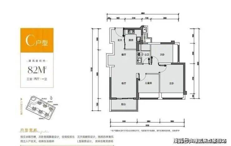 82㎡的3房2厅1卫,设计的是竖厅格局,客厅3.3米开间,S墙体设计预留双开门冰箱位,动静分区,三开间朝南,3个卧室宽度分别为3/2.8/2.5米,得房率:88.87-90.61%(包含赠送),L型厨房,阳台进深1.5米,朝西南或东南向。