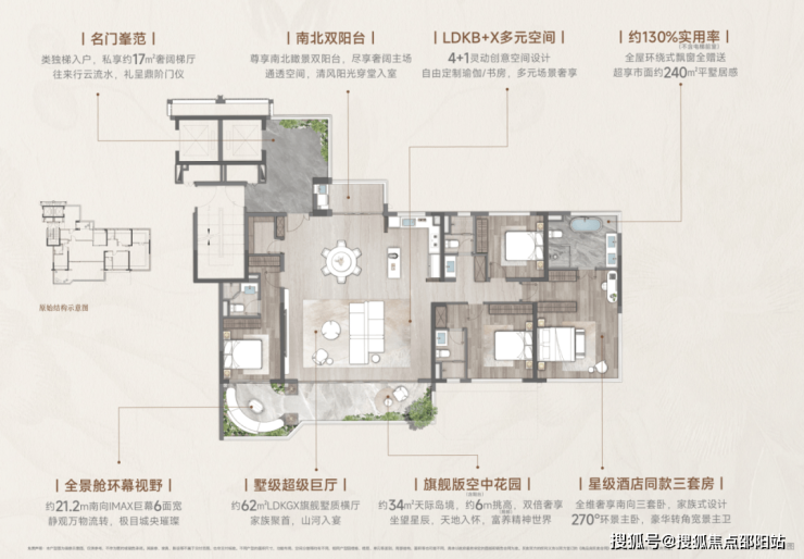 约21米超大面宽,惊人的6开间朝南,270°环绕式采光,搭配全面屏跑道式转角窗。