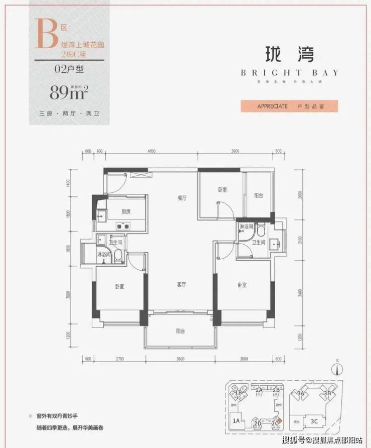 建筑面积约89㎡三房两厅两卫,东南朝向,双阳台,主卧套房设计。