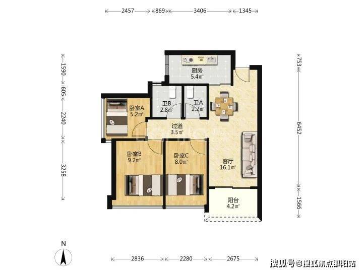 小区:豪方天际·88㎡·南北通透3房2卫;