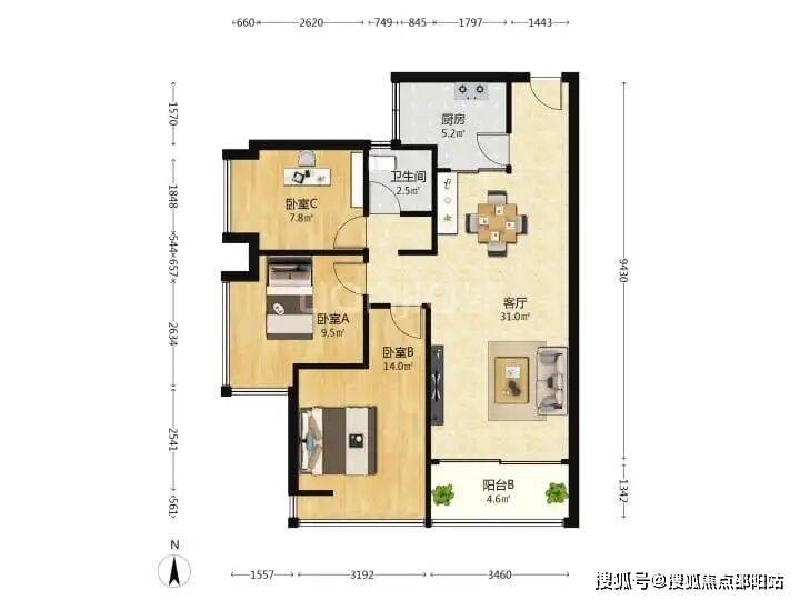 L动静分区明显,三开间朝南,主卧带转角飘窗