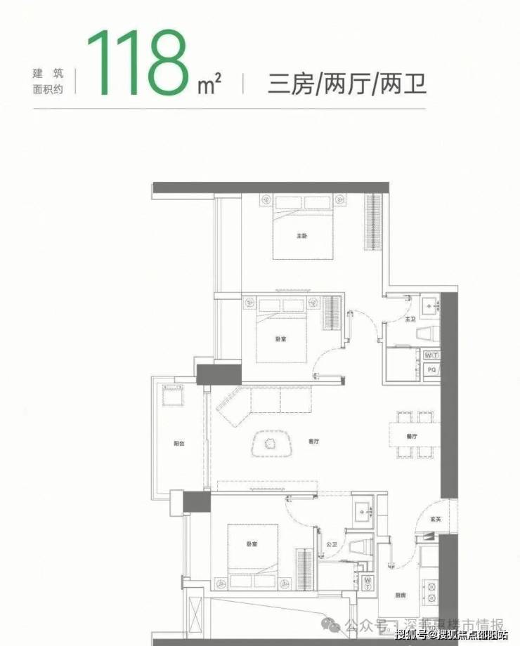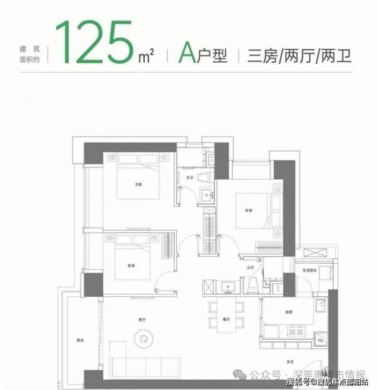 项目主力产品是建面约110㎡三房两厅两卫,约118㎡三房两厅两卫,约125㎡三房两厅两卫,三种户型户型。