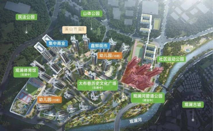 溪山禾玺原为龙华观澜大布巷片区城市更新单元,大大小小地块共20个,主要为二类居住用地、商业用地、教育设施用地、公园绿地等,共分为4期开发建设。