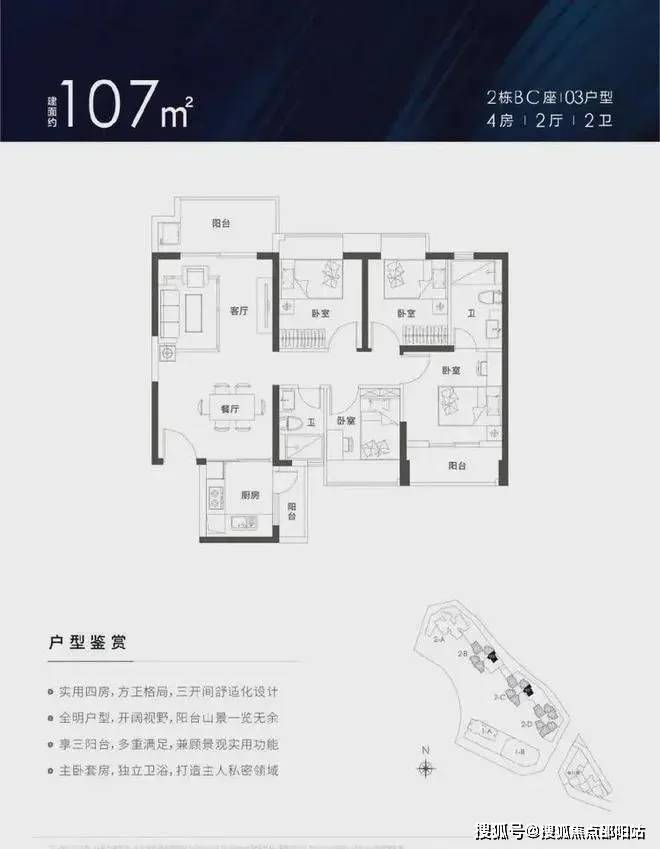107㎡的4房2厅2卫,设计的竖厅格局,客厅主卧双阳台设计,厨房也带小阳台,客厅朝东北向,高层可看水库景观。