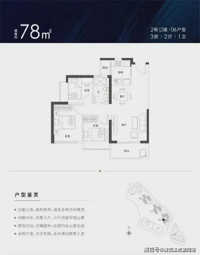 78㎡的3房2厅1卫,设计的竖厅格局,三开间朝南,厨房带小阳台,客厅西南朝向,高楼层可看山景。