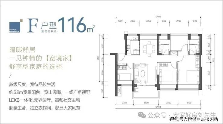 116㎡的4房2厅2卫,F户型,设计的是竖厅南北通透格局,餐客厅一体化设计,客厅3.8米开间,四开间朝南,4个卧室分别做到了主卧18.02㎡/次卧12.3㎡/次卧8.7㎡/次卧8.37㎡(包含墙体飘窗),都不用搭配飘窗做床,L型厨房,卫生间干湿分离,得房率约:88%(包含赠送),阳台主朝西南或东南向。