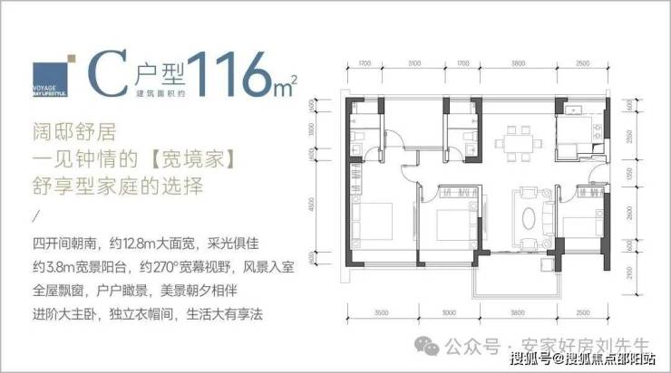 116㎡的4房2厅2卫,C户型,设计的是竖厅南北通透格局,餐客厅一体化设计,客厅3.8米开间,四开间朝南,4个卧室分别做到了主卧17.85㎡/次卧11.4㎡/次卧9.3㎡/次卧8㎡(包含墙体飘窗),都不用搭配飘窗做床,U型厨房,卫生间干湿分离,得房率约:93.13%(包含赠送),阳台主朝西南、东南或正南向。