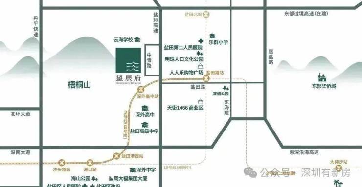 地铁8号线:项目临近“深圳黄金南环线”8号线“深外高中站”直线距离约500m。