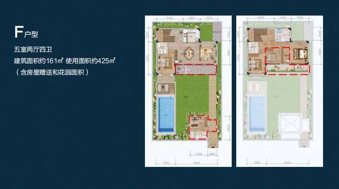 五室两厅四卫,建筑面积约179.90㎡,拓展后使用面积约411.99—476.99㎡(含房屋赠送和花园面积