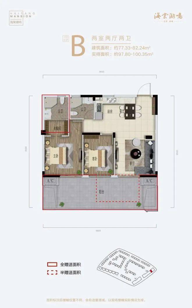 B户型 建筑面积77-82㎡,两房两厅两卫