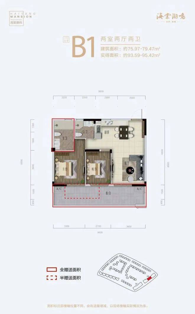 B1户型 建筑面积75-79㎡,两房两厅两卫