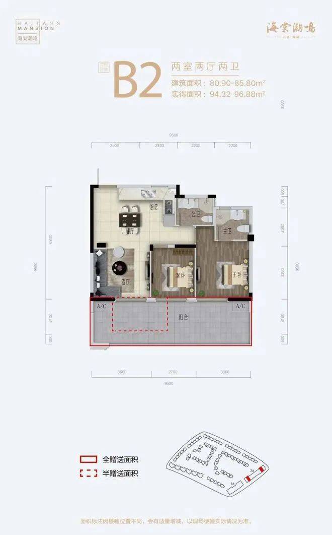 B2户型 建筑面积80-85㎡,两房两厅两卫