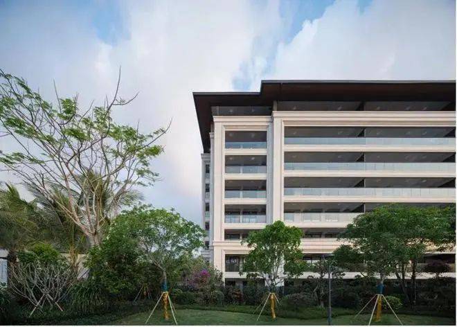 迎合三亚强晒多雨的气候条件,洋房在南向设置了通长大阳台,结合层间线条强调建筑主体舒展大气的横向韵律。