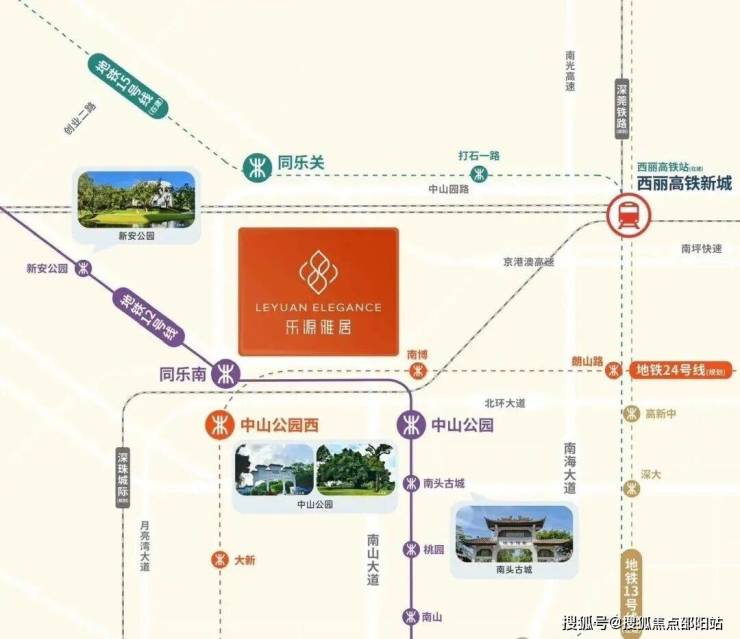 12号线同乐南站(直线约500m),1站中山公园,2站到西丽高铁站(在建中),4站到科技园,5站到前海;