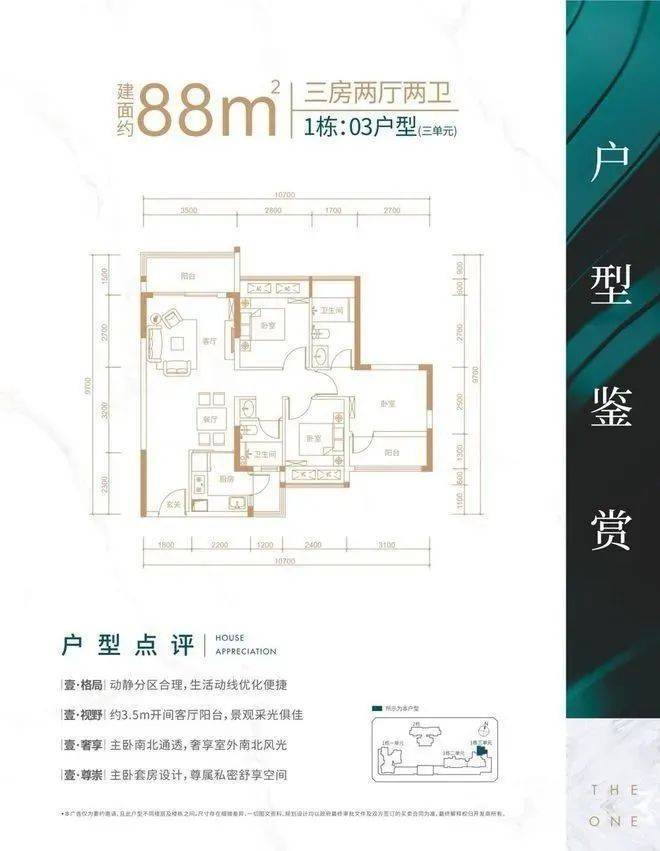89㎡3房2厅2卫(单价7-7.6万总价610-680万)客厅朝南带阳台,2房朝南,1房朝北该户型分布在1栋3单元01,02房