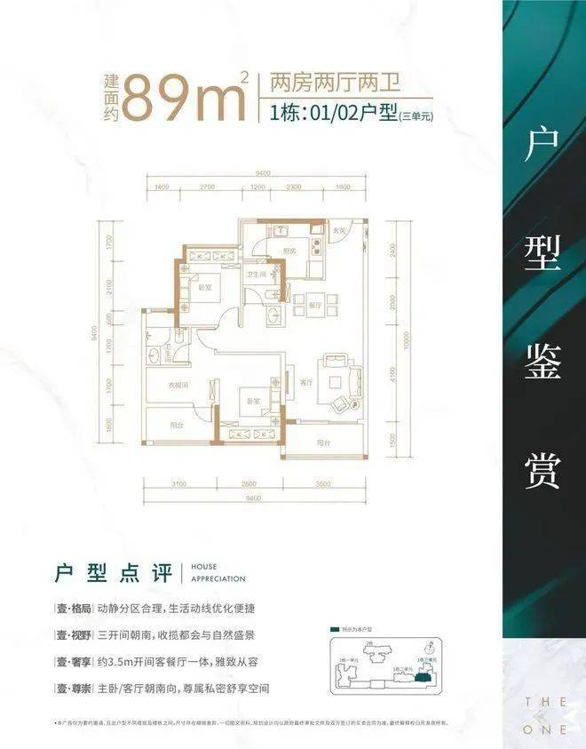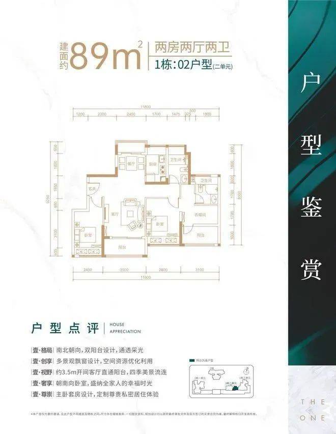 89㎡3房2厅2卫(单价7-7.6万总价615-680万)客厅南北通朝南带阳台,3房朝南该户型分布在1栋2单元02户型
