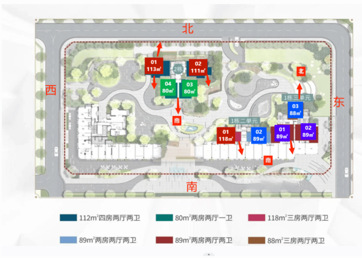 88㎡3房2厅2卫(单价7-7.6万610-660万)客厅朝北带阳台,1房朝北,2房朝南该户型分布在1栋三单元03号房